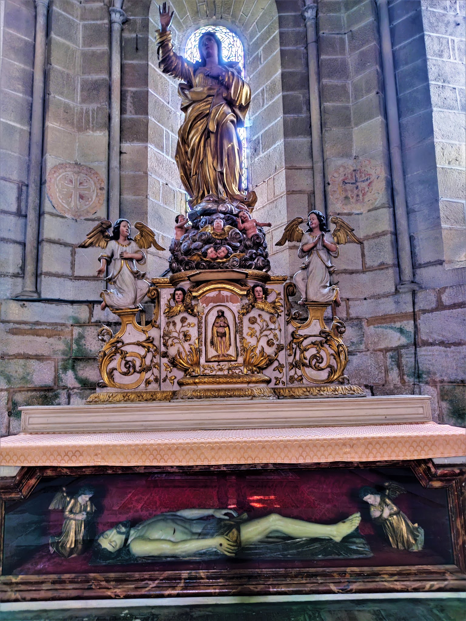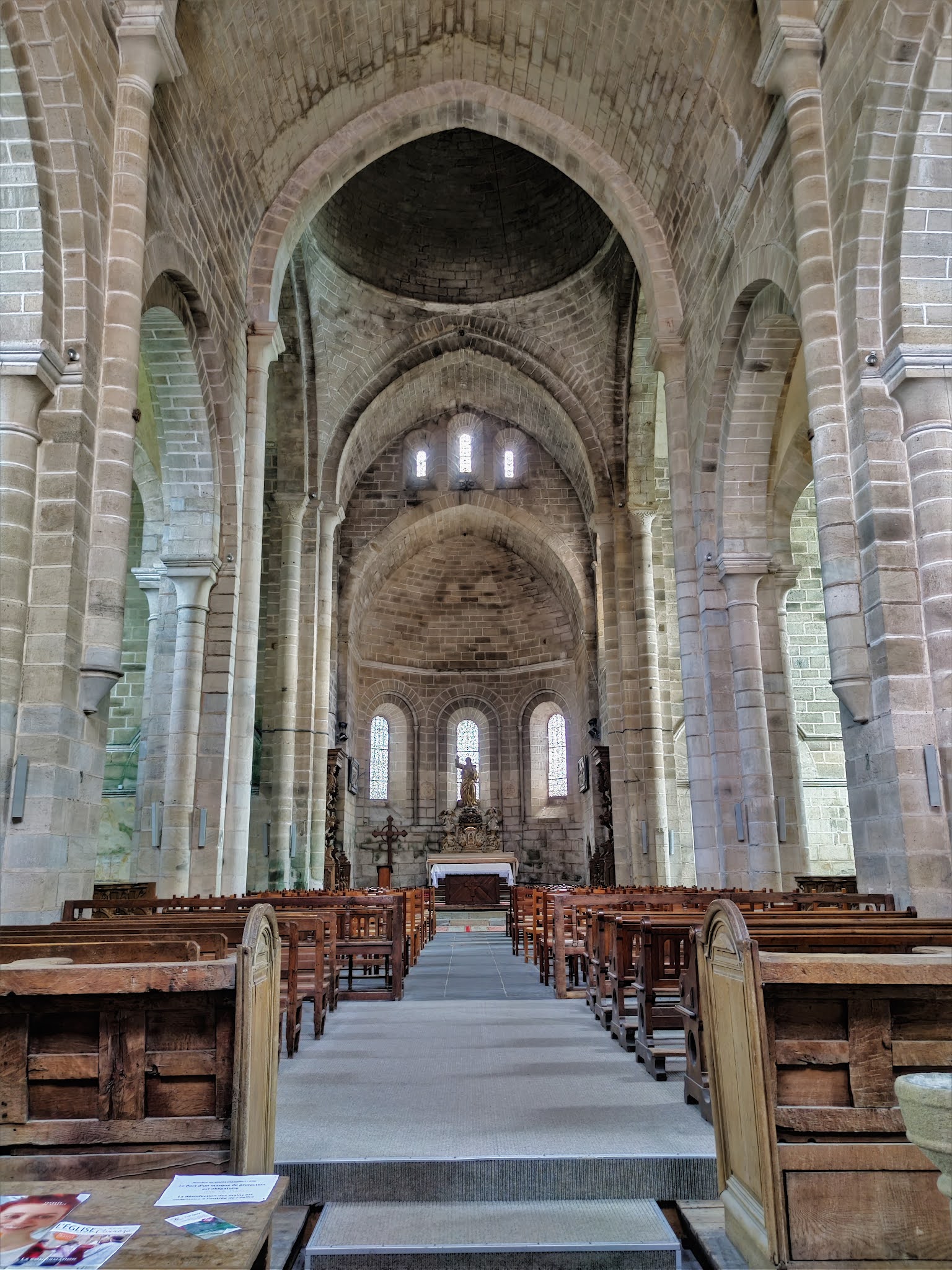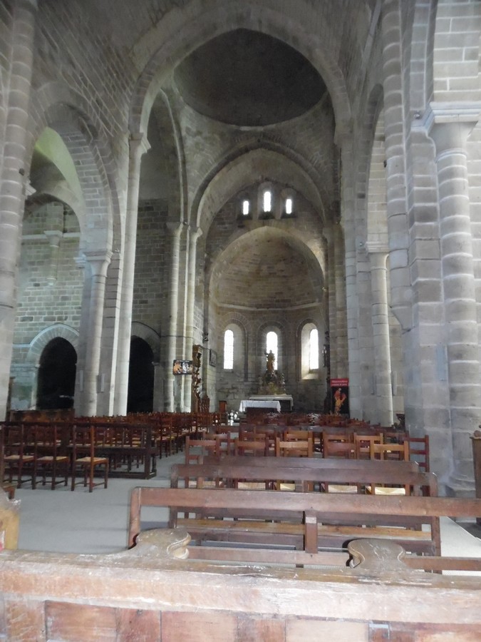 Découvrir cette abbatiale fut un superbe moment même si je n'ai pas fait la visite guidée de l'Abbaye. L'abbatiale romane en impose par ses dimensions, sa façade surmontée d'un clocher-mur à 3 arcades, et son clocher octogonal qui s'élève à la croisée du transept. A l'intérieur, la nef aussi large que le transept ouvert de 6 chapelles prolonge cette impression d'immensité. Fondée au 12ème siècle par Étienne de Vielzot (1085-1159) qui deviendra Saint-Etienne-d 'Aubazine, l'abbatiale construite de 1156 à 1190, fut à sa création la plus grande du Limousin. Au 18ème siècle, par manque de moyens financiers, elle sera raccourcie de 6 travées. Saint-Etienne-d 'Aubazine fut un grand pénitent, sa pratique de l'ascèse par mortification l'avait fait reconnaitre des foules. Son pouvoir de conviction lui permit de réunir une grande communauté d'hommes, puis en 1142, il créa le monastère du Coyroux, communauté de femmes. L'abbaye devint double, sous l'autorité de l'abbé, les hommes devaient pourvoir au besoins de la communauté féminine. Le modèle différait sensiblement de celui de l'abbaye de Fontevraud (fondée en 1101 Robert d'Arbrissel), abbaye double sous l'autorité d'une Abbesse. Des trésors sont abrités dans cette abbatiale, une Piéta en pierre polychrome du 15ème siècle, des stalles du 18ème siècles aux miséricordes sculptées, des autels et retables de belle facture. La merveille est le tombeau du titulaire, un ouvrage en calcaire du 13ème siècle, création remarquable offerte par Saint-Louis. Son état de conservation est excellent. Découvrir cette abbatiale fut un superbe moment même si je n'ai pas fait la visite guidée de l'Abbaye.