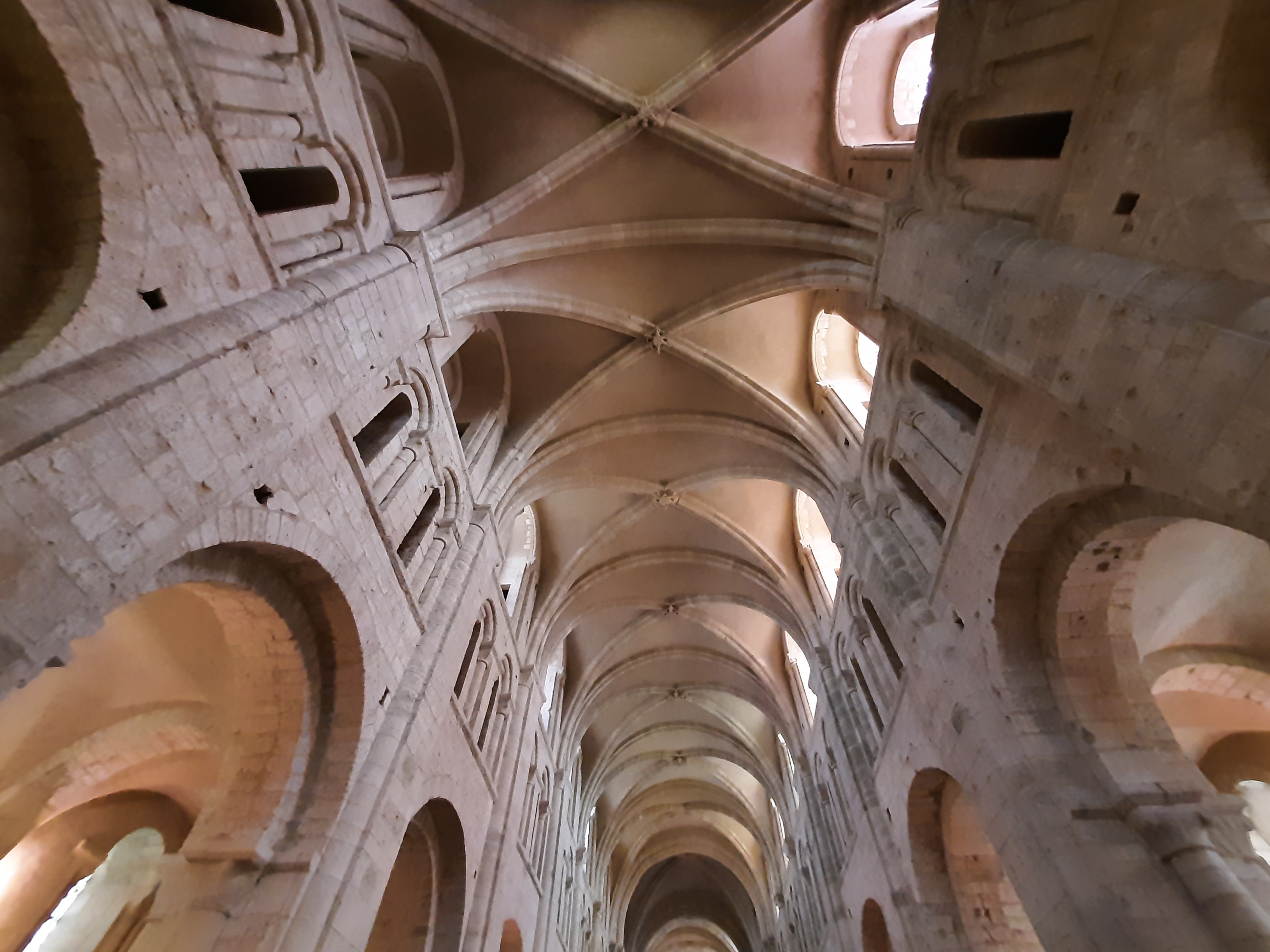 Grande abbaye restaurée après guerre. La toute première voûte d'ogives